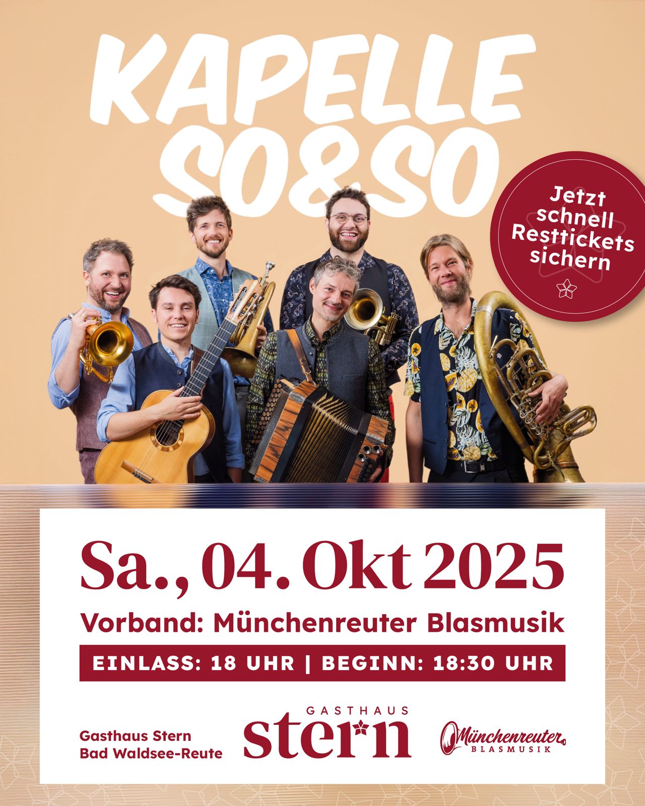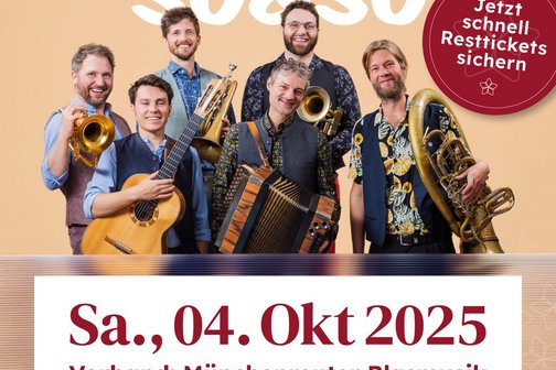 Nach einigen Jahren Pause öffnen wir den Sternensaal Reute wieder für eine musikalische Veranstaltung. Dieses Mal gibt es einen wunderbaren Blasmusik-Abend der ganz besonderen Güte. Die Kapelle So & So tourt seit einigen Jahren durch den süddeutschen Raum mit verschiedenen Programmen und begeistert das Publikum. Im OKTOBER 2025 spielen sie nun endlich bei uns im Sternensaal mit dem neuen Programm "Trompetuum Mobile".